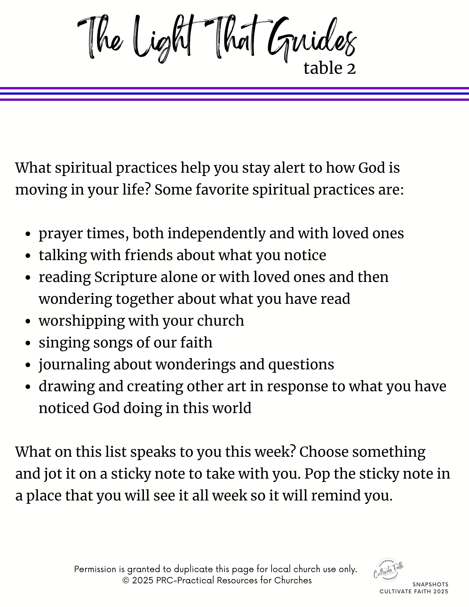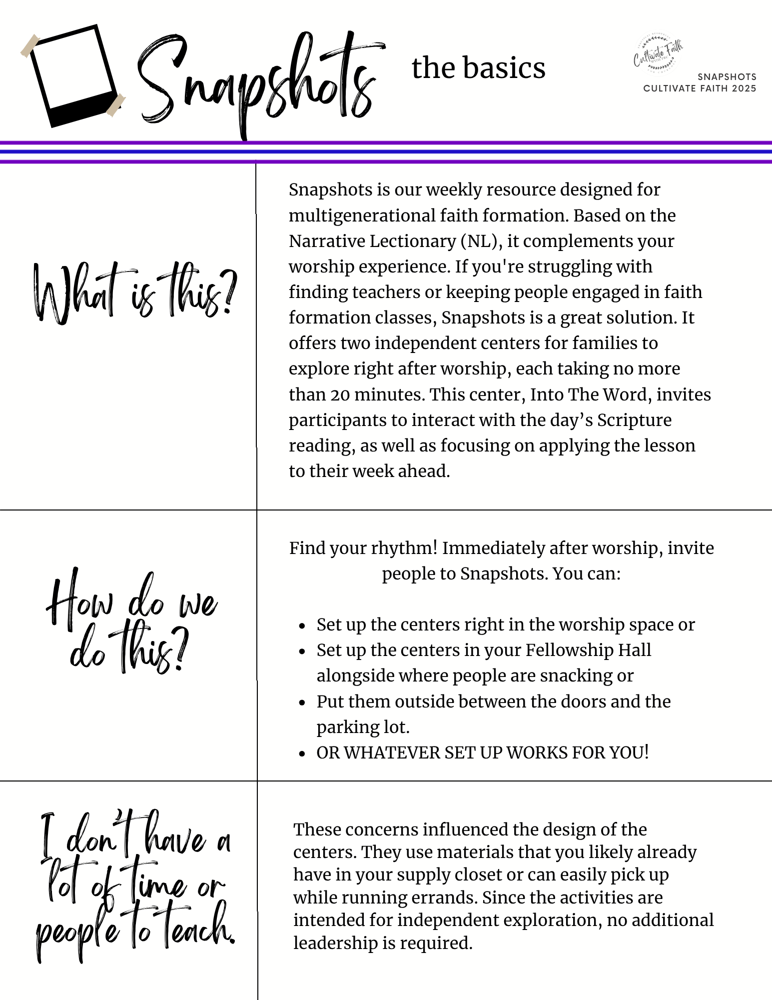 Snapshots gives you the plans you need to hold innovative faith formation for the generations immediately after worship. No teachers? No problem. No dedicated time for faith formation? Claim the 15 minutes after worship when people are enjoying fellowship. Our Snapshots resources gives you: