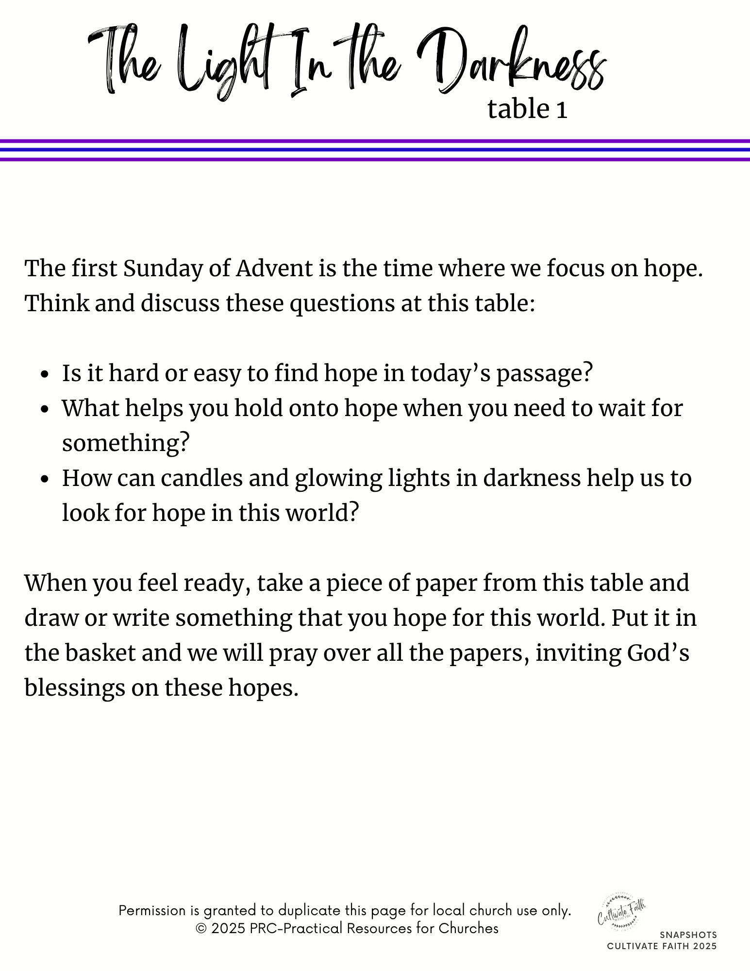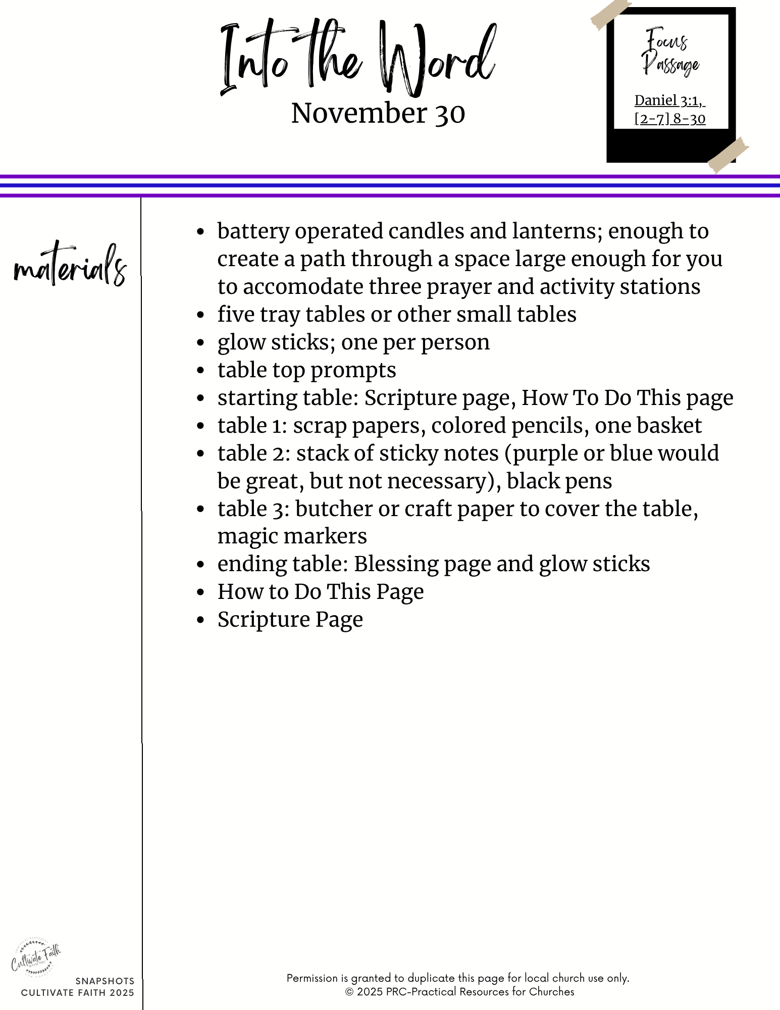 Snapshots is our resource that helps you creatively connect the Scripture and themes in worship with interactive, multigenerational centers. It is part of our Connections resources, designed specifically to help congregations connect their worship, faith formation, and families for today’s dynamic church settings. The Scripture passages are:
