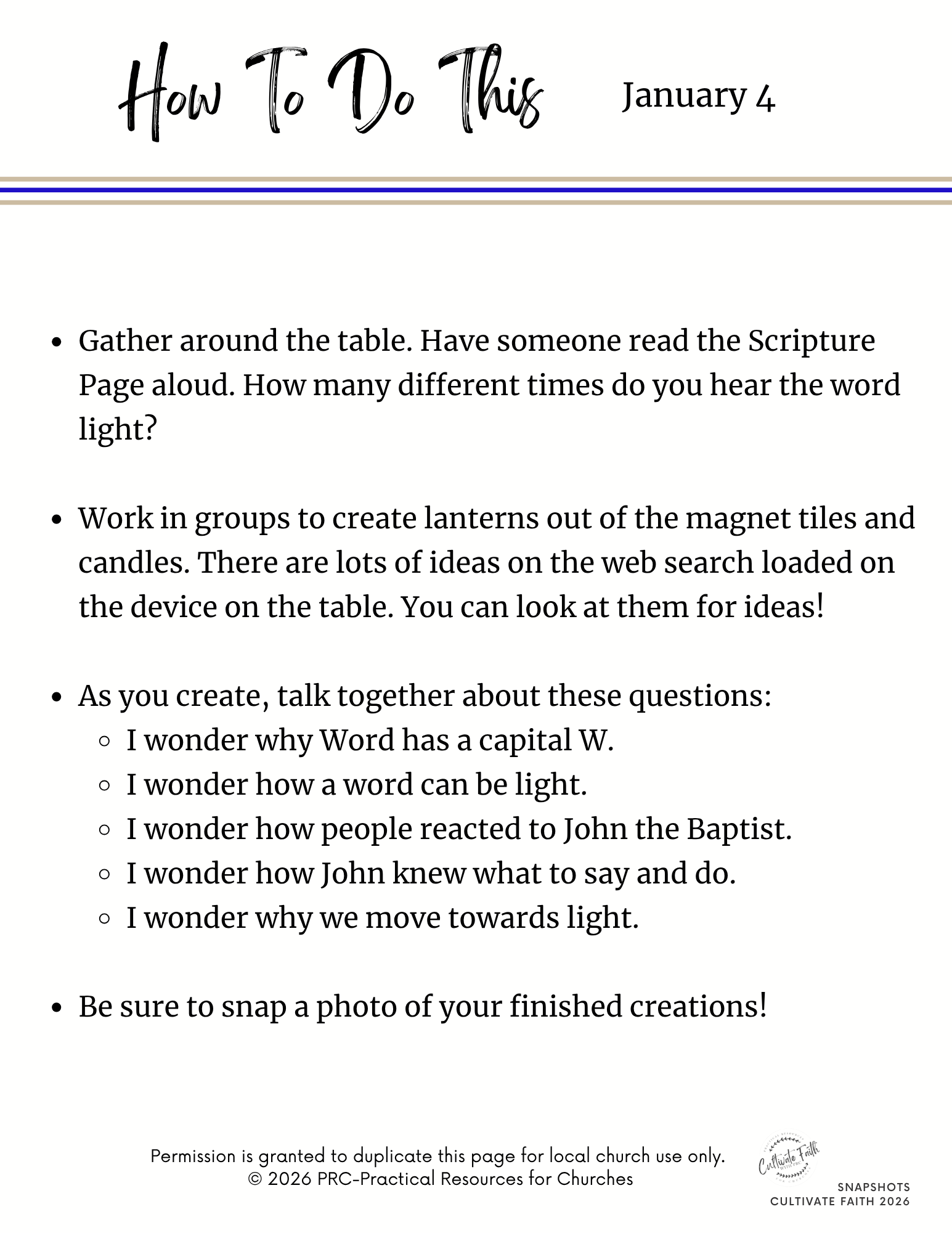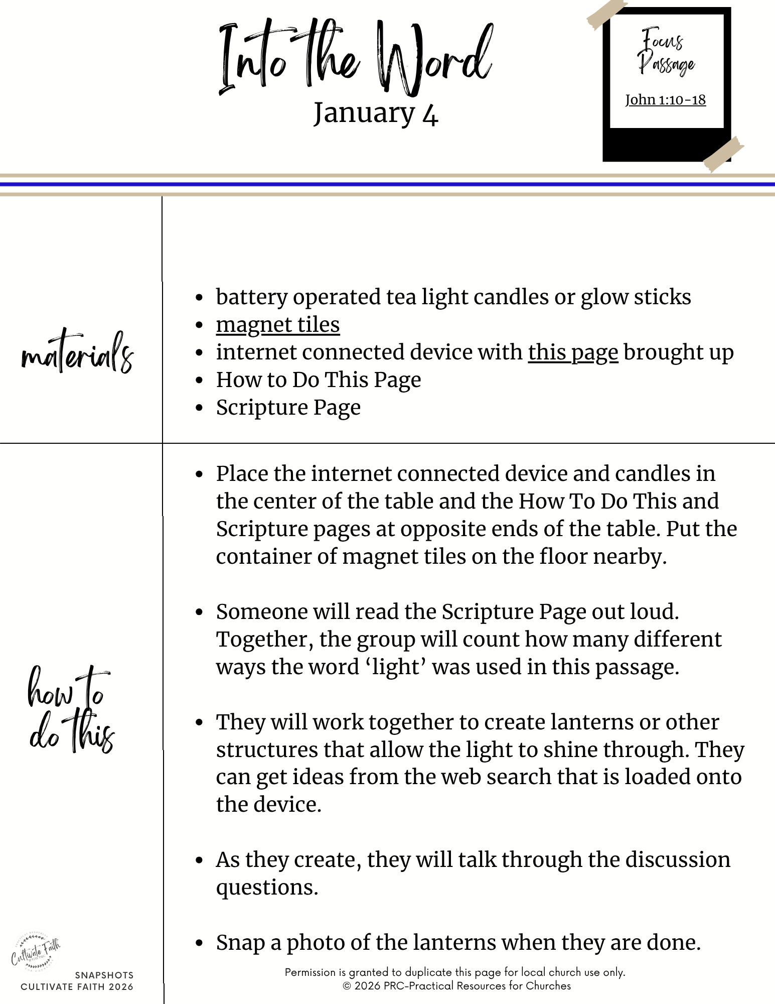 Snapshots is our resource that helps you creatively connect the Scripture and themes in worship with interactive, multigenerational centers. It is part of our Connections resources, designed specifically to help congregations connect their worship, faith formation, and families for today’s dynamic church settings. The Scripture passages are: