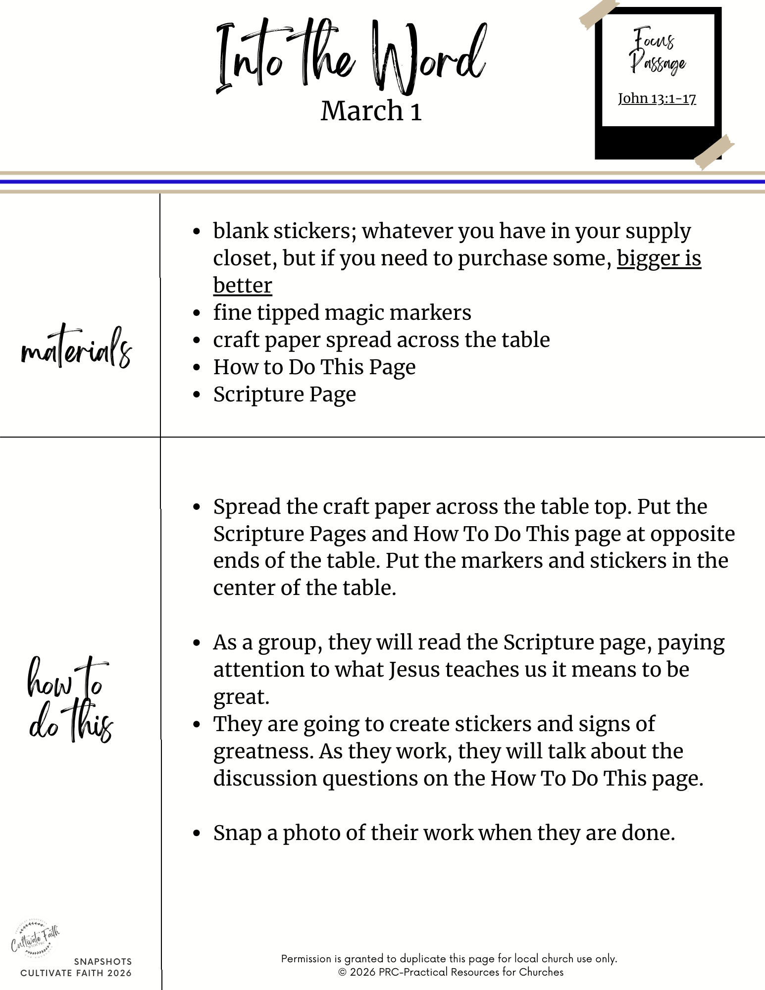 Snapshots is our resource that helps you creatively connect the Scripture and themes in worship with interactive, multigenerational centers. It is part of our Connections resources, designed specifically to help congregations connect their worship, faith formation, and families for today’s dynamic church settings. The Scripture passages are: